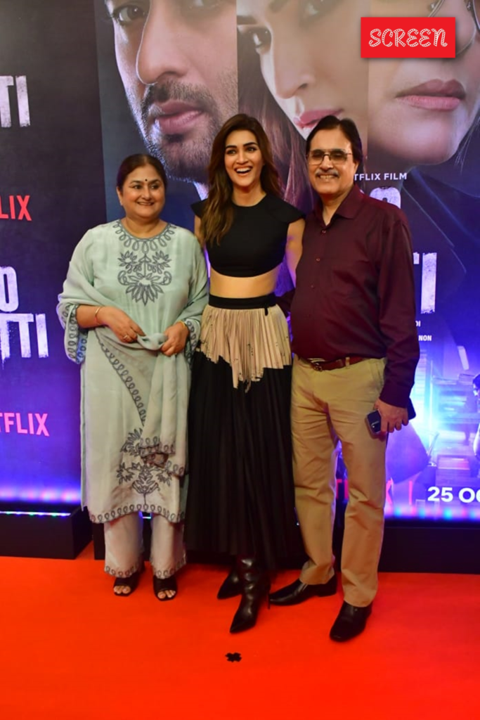 Kriti was dressed in a black crop top and high-waisted pleated maxi skirt. Kriti’s parents, Geeta and Rahul Sanon, were also in attendance. Kriti is seen in dual role in the film. Do Patti also marks her first production venture.
