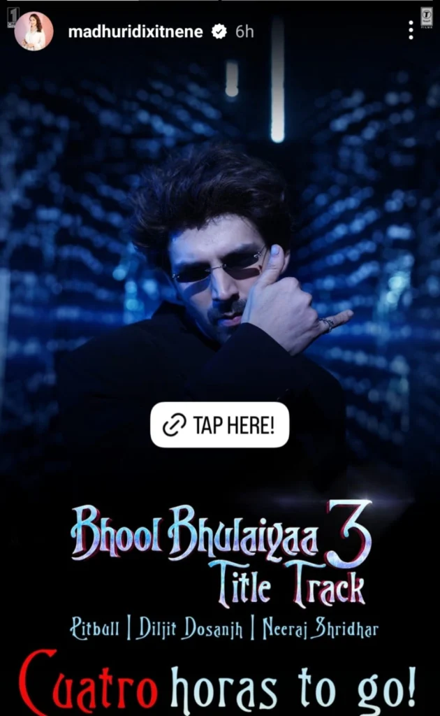 Madhuri Dixit took to her social media and wrote on the poster of the title track – “Cuatro horas to go!”