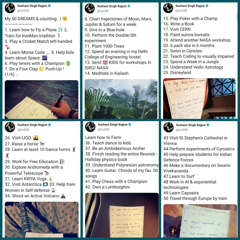 With Thanks Refrence to: https://www.amarujala.com/photo-gallery/entertainment/bollywood/sushant-singh-rajput-dreams-missing-sushant-singh-rajput-list-of-50-dreams-from-flying-a-plane-to-sending-kids-to-nasa?pageId=6