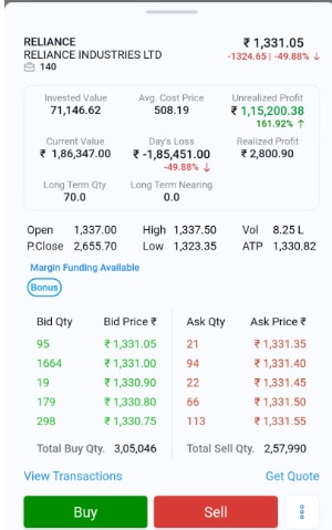 RIL shares: The most-valued stock on stock exchanges opened at Rs 1,338 apiece, which was 49.61 per cent lower than Friday’s closing price of Rs 2,655.45 for the stock. On adjusted basis, however, the stock was up 0.77 per cent.