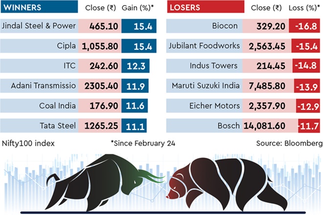 Auto manufacturers dominate the list of laggards as surge in oil prices dented the demand for cars and two-wheelers in the country. Shares of Maruti Suzuki and Eicher Motors have lost 13-14% since February 24. That was followed by Hero MotoCorp and Tata Motors, each falling 11% during the same period.