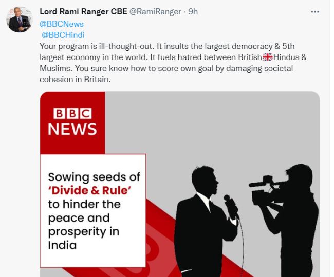 ब्रिटेन के उच्च सदन कहे जाने वाले हाउस ऑफ लॉर्ड्स के सदस्य लॉर्ड रामी रेंजर ने प्रधानमंत्री नरेंद्र मोदी पर हमला करने वाली एक न्यूज सीरीज को लेकर बीबीसी की कड़ी आलोचना की है। बीबीसी की निंदा करते हुए रेंजर ने उसपर पक्षपाती रिपोर्टिंग का आरोप लगाया है। उन्होंने ट्वीट कर कहा, ‘BBC News आपने एक अरब से अधिक भारतीयों को बहुत कष्ट पहुंचाया है। यह लोकतांत्रिक रूप से चुने गए भारतीय पीएम, भारतीय पुलिस और न्यायपालिका का अपमान है।
