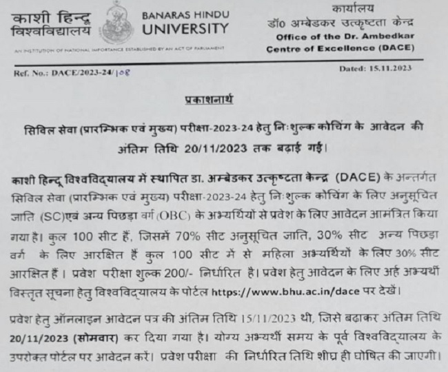 With Thanks Reference to: https://www.jagran.com/news/education-upsc-free-coaching-bhu-apply-for-bhu-upsc-free-coaching-at-bhu-ac-in-dace-application-window-will-close-tomorrow-23584070.html
