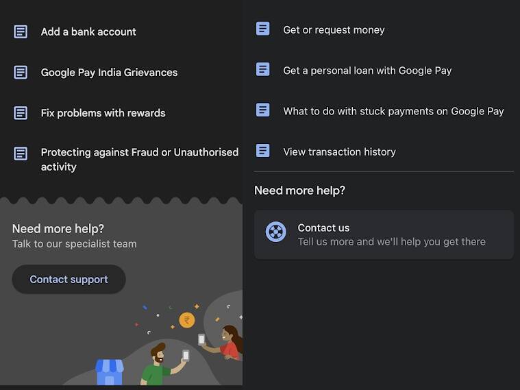 Next click on get help > click on contact support, which will be on the bottom part of the page. On the next page, click on contact us, which is at the bottom of the page, and you can type a short description of your issue and press next and select the exact issue that you are facing on Google UPI.