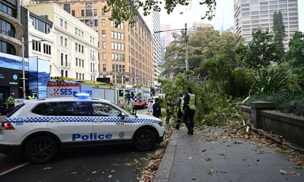 Two people have been injured after strong winds knocked over a tree blown in Sydney’s Hyde Park as wild weather lashed the city.
